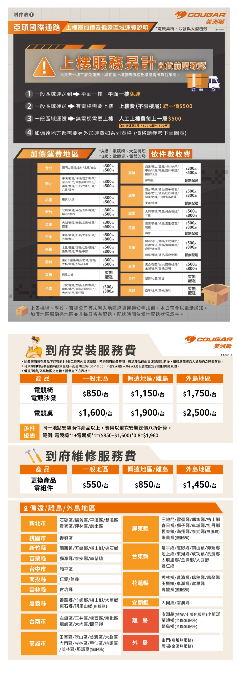 1.宅配到府(偏遠地區及離島地區運送大型物件須額外加價運費,詳細圖表如下)
