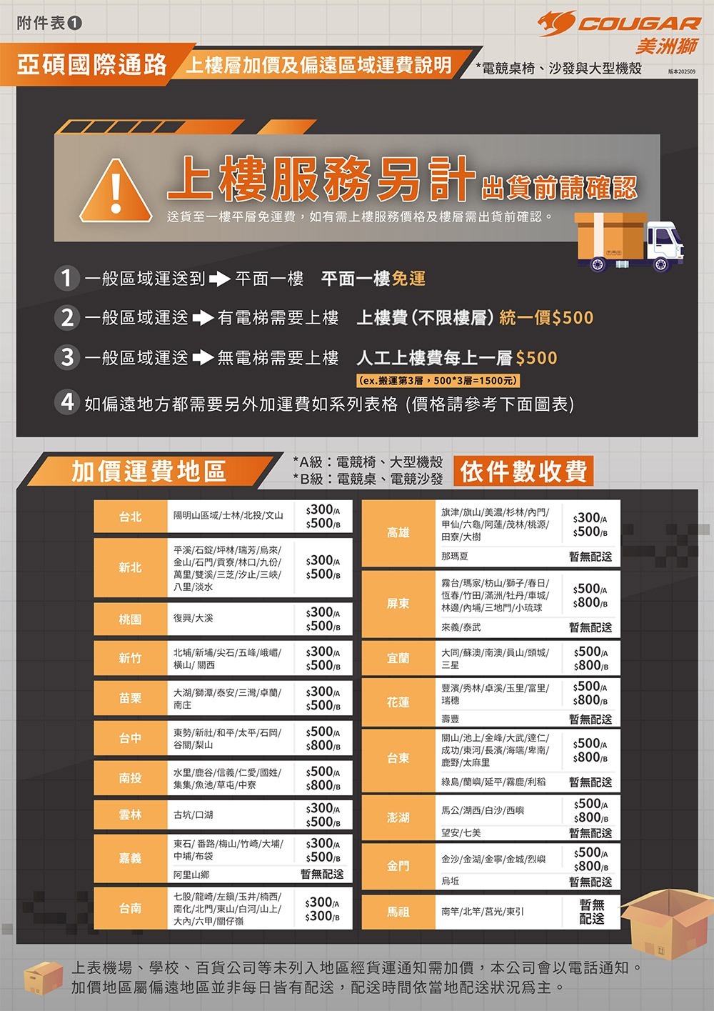 • 配送注意:貨運司機"只"配送至平面[一樓], 若需搬運上樓,請選-樓層搬運費