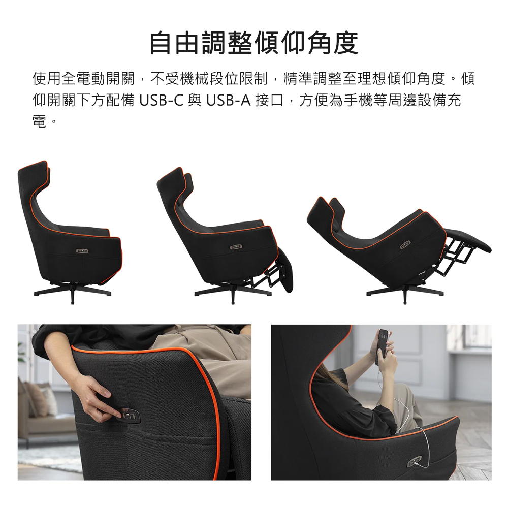 ・椅側雙USB-A/C充電孔,邊充電邊使用超便利