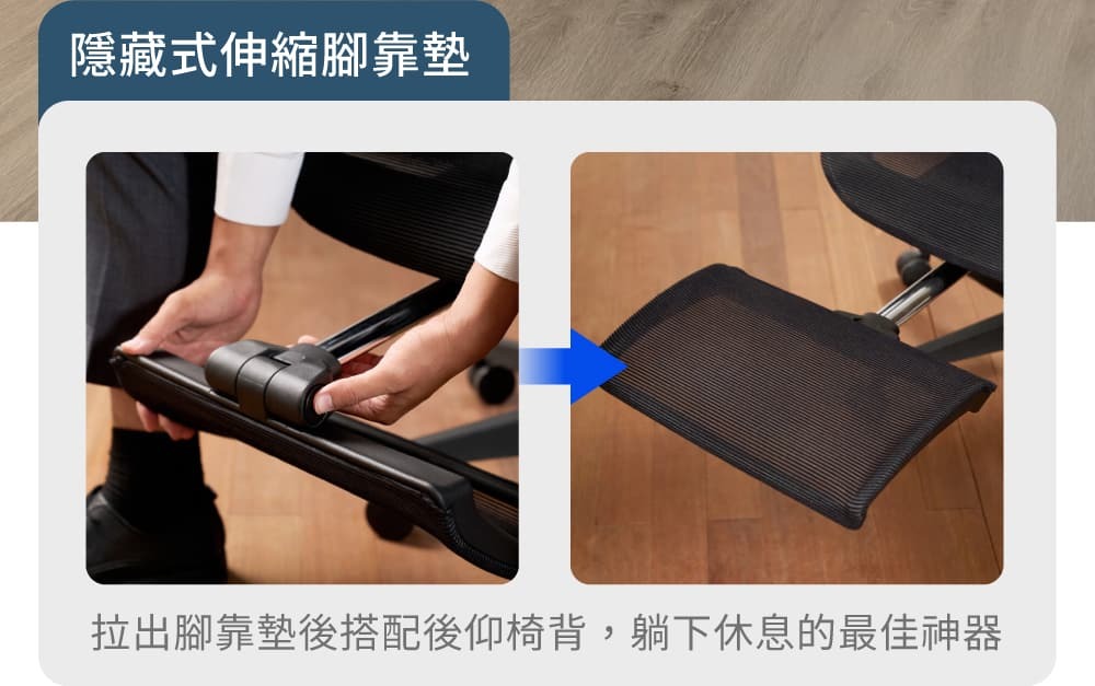 • 隱藏式伸縮腳靠,躺下休息更舒適