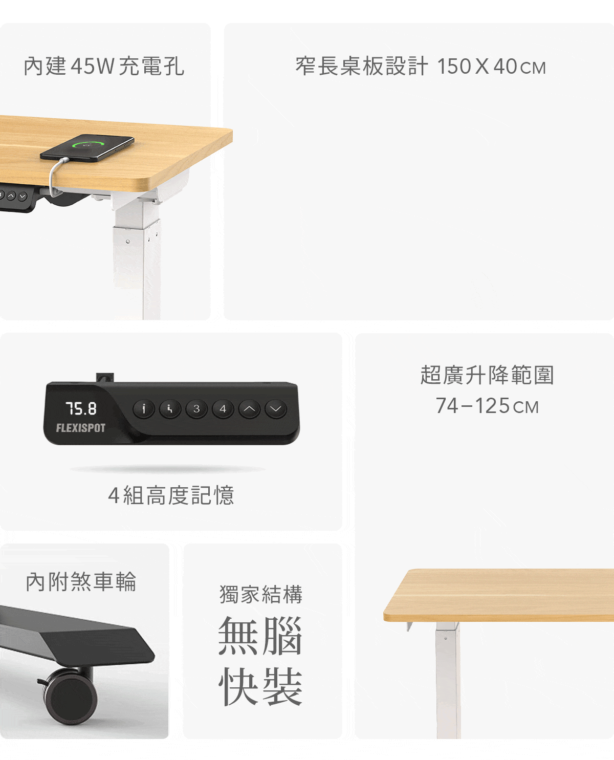 Flexispot 獨家專利快裝結構,為你簡化零件數量和惱人的安裝步驟,桌板上特殊的滑軌設計,直覺的引導桌腳靠上,整個安裝過程自然流暢不燒腦,讓你第一次 DIY 就上手,成就感滿滿!
