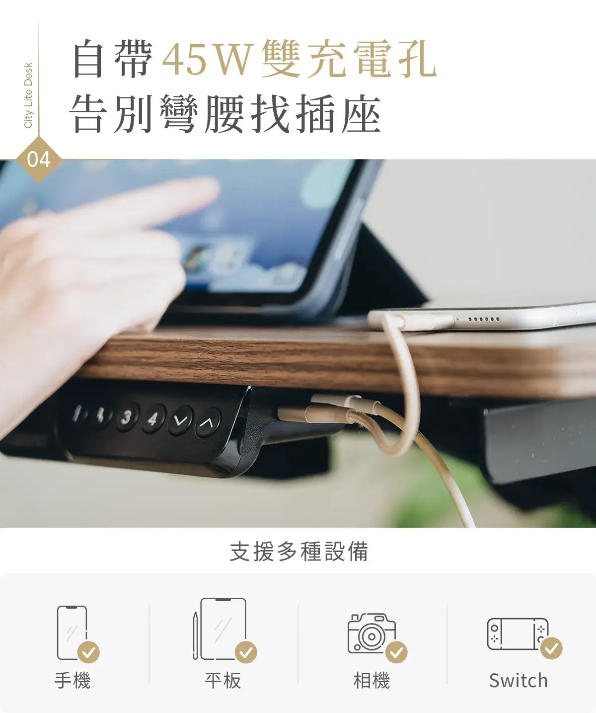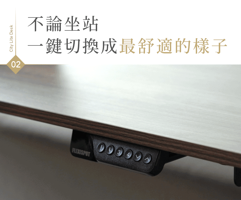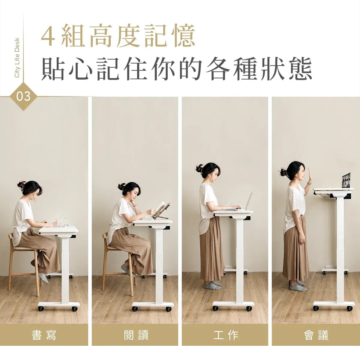 不用每次都要想破頭、上上下下重新調整了!City Lite 貼心為你記住四種最常使用的桌面高度,不論是站著辦公、坐著追劇還是趴著小睡,輕鬆一按,準確到位!