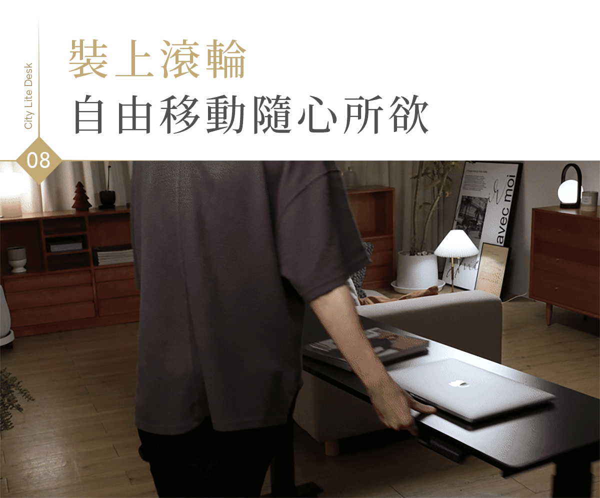 那快點為你的 City Lite 裝上輪子吧!Flexispot 貼心內附 4 個靜音滾輪 (高強度 PA 緩衝 PU材),讓你可以輕鬆推著 City Lite 自由、優雅地穿梭在家中的任何空間裡。