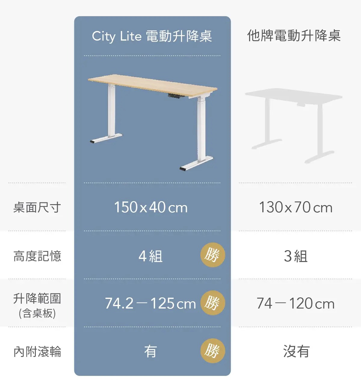 我們在兩年內搜集了近萬名使用者的反饋,獨創窄長桌身設計,在外型及功能之間取得完美平衡,讓你顧及健康的同時,也可以有效的安排空間,「City Lite 電動升降桌」就此誕生!