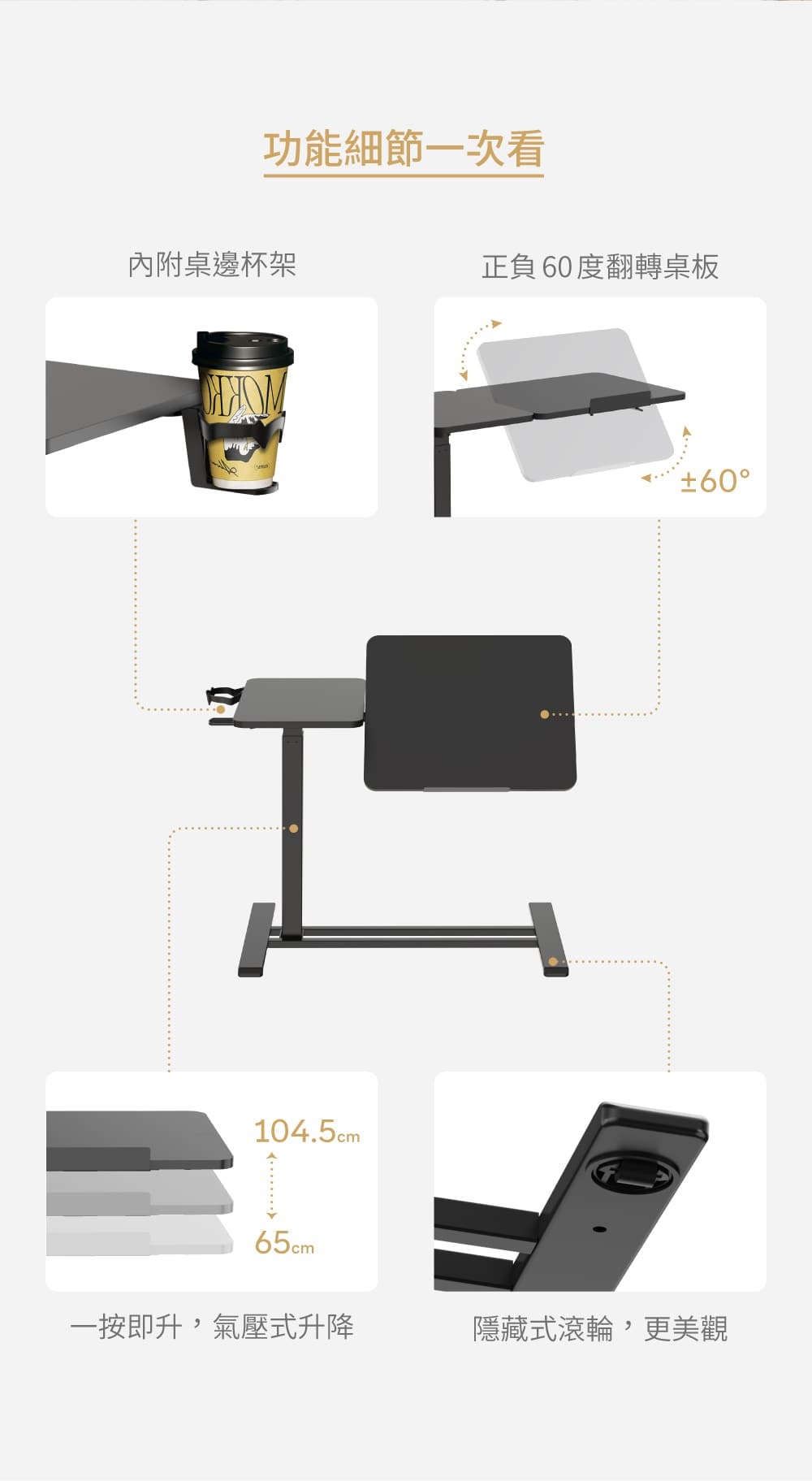 • 可翻轉桌板 | 桌面可傾斜60°,看書、看影片更符合人體工學