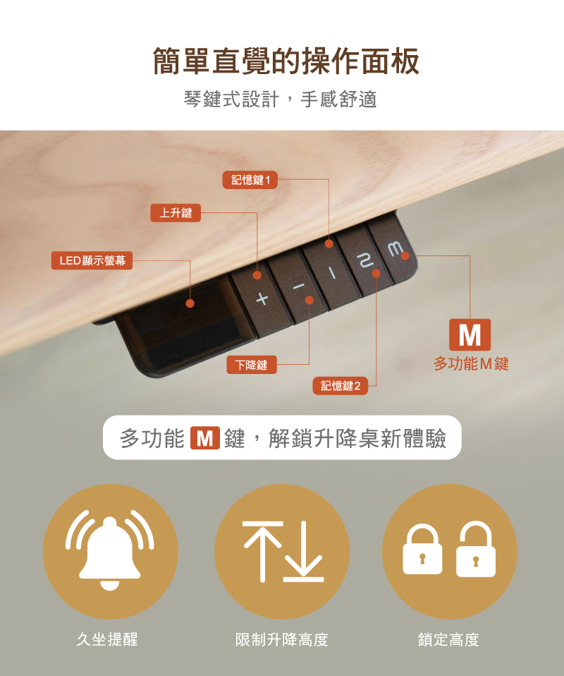 • 琴鍵式手控器 | 直覺操作,久坐提醒、鎖定高度