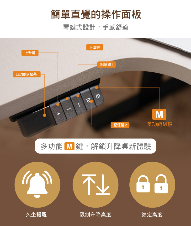• 琴鍵式手控器 | 直覺操作,久坐提醒、鎖定高度