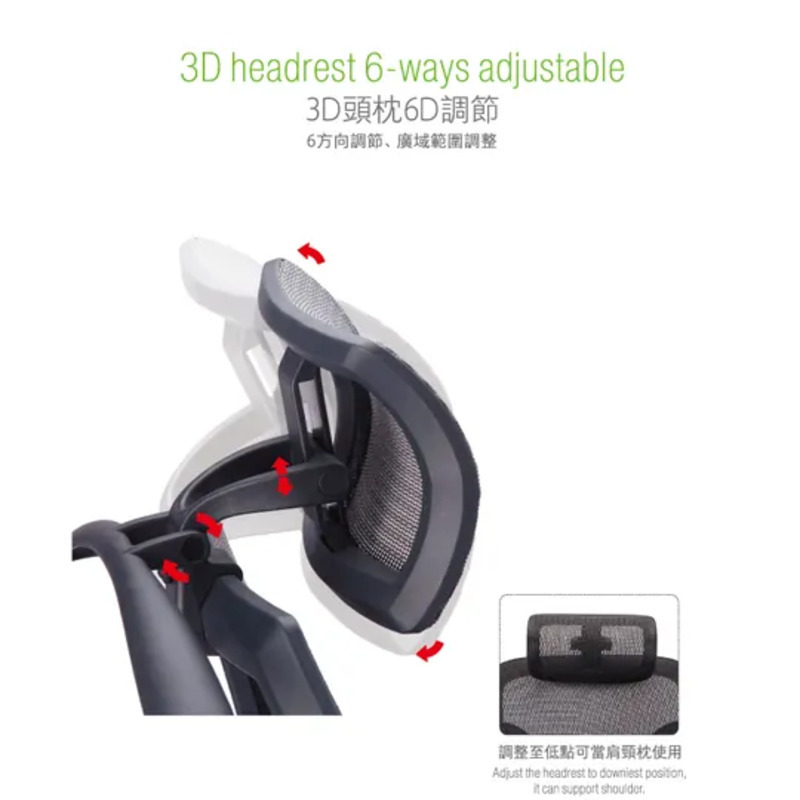 ・3D可調式頭枕,上下五段調整,減輕頸部壓力