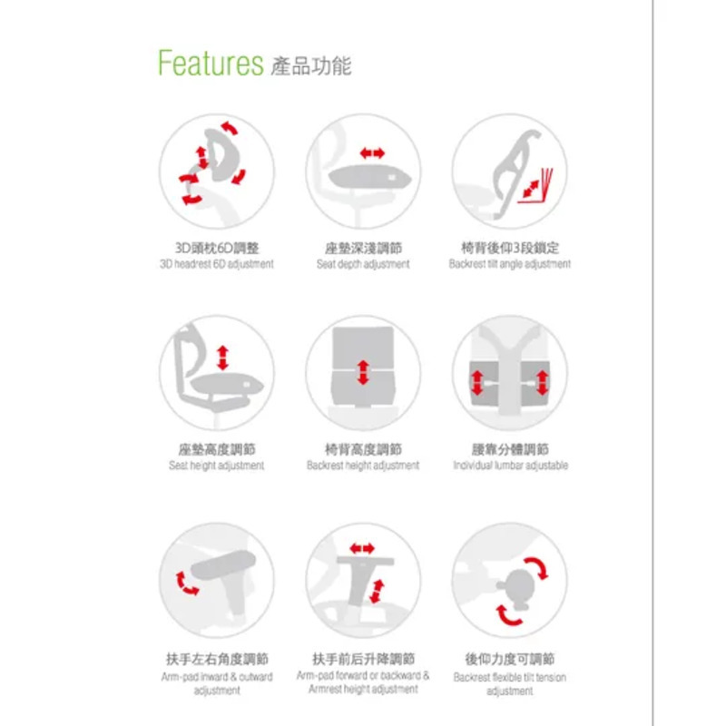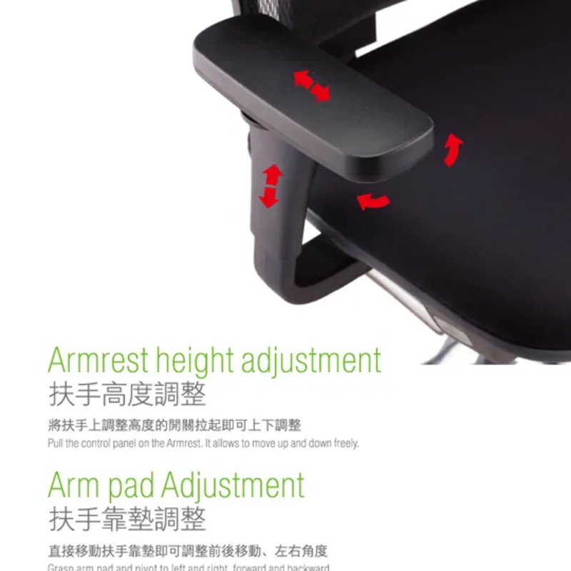 ・3D多向扶手,高度、前後、左右皆可調整