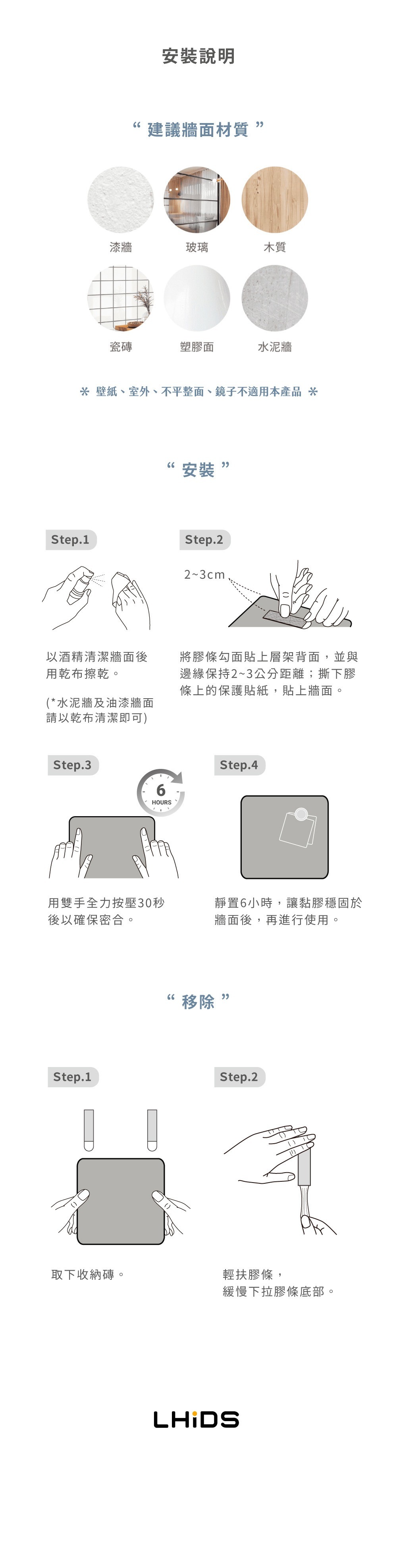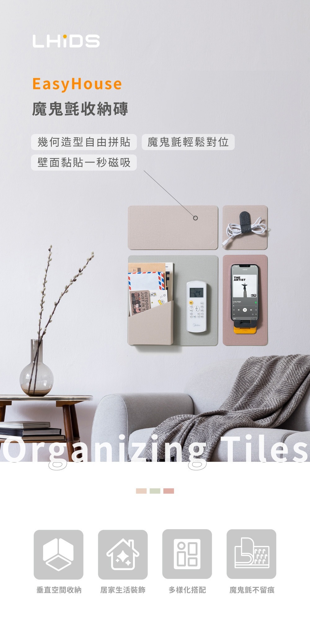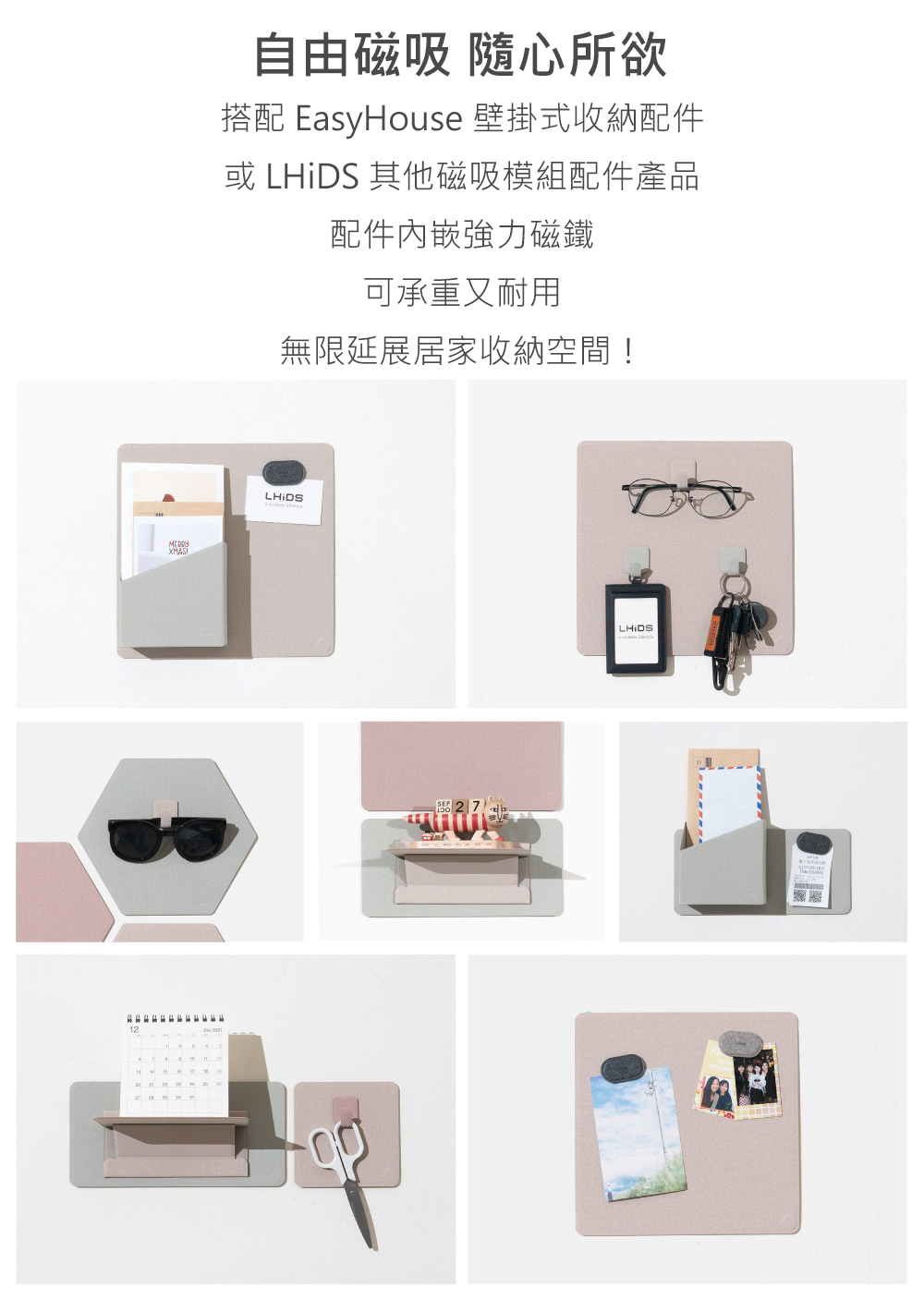 (1) 收納磚材質為鐵片,可磁吸含有磁鐵的物品;使用時請搭配含有磁鐵的物品或LHiDS磁吸配件一起使用