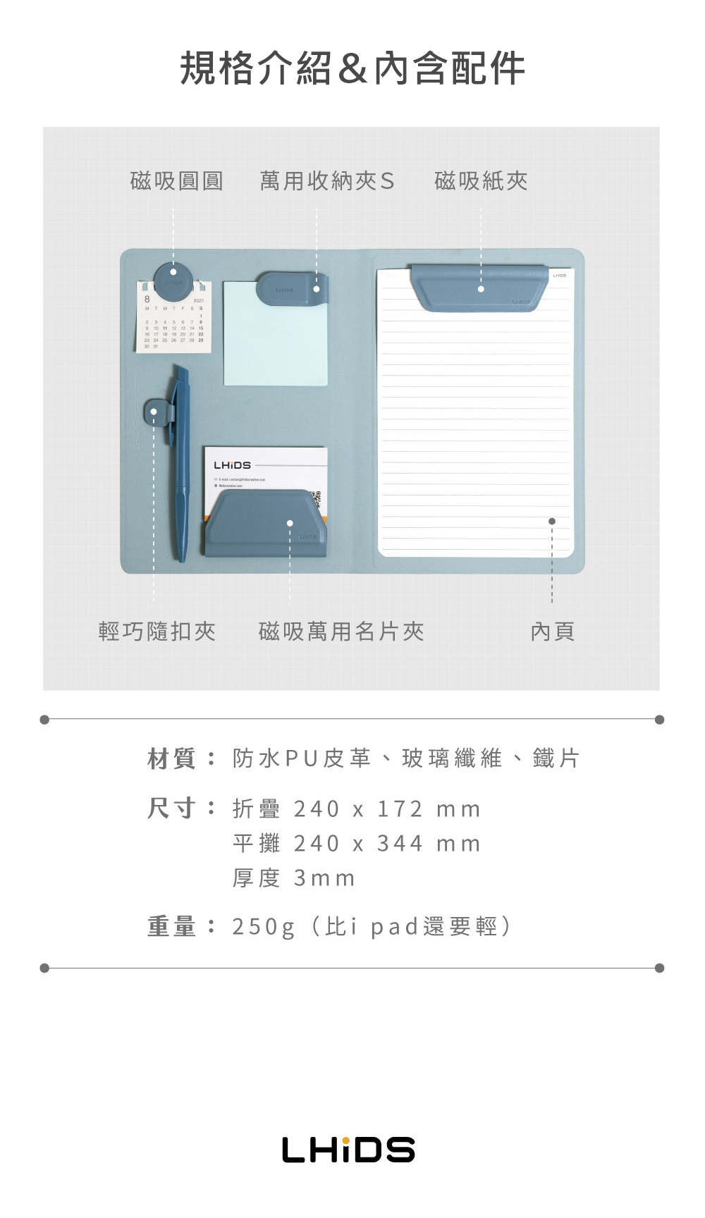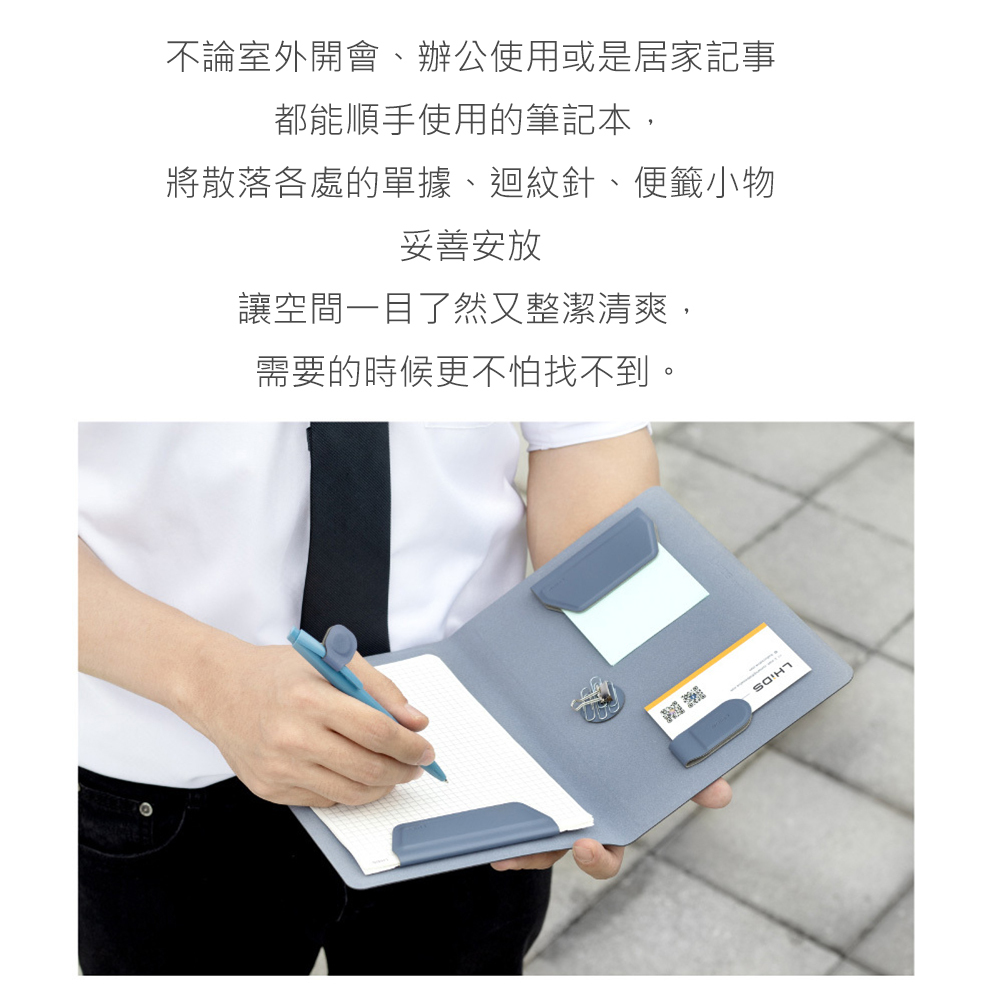 • 方便攜帶的LHiDS磁吸收納筆記本可讓您隨心所欲且安全地存放日常必需品,如:信用卡、名片、耳機、書寫用具等