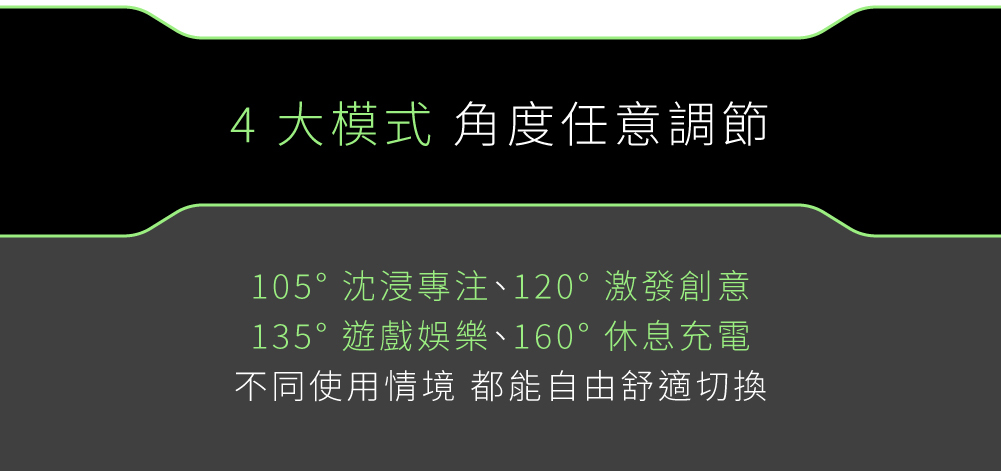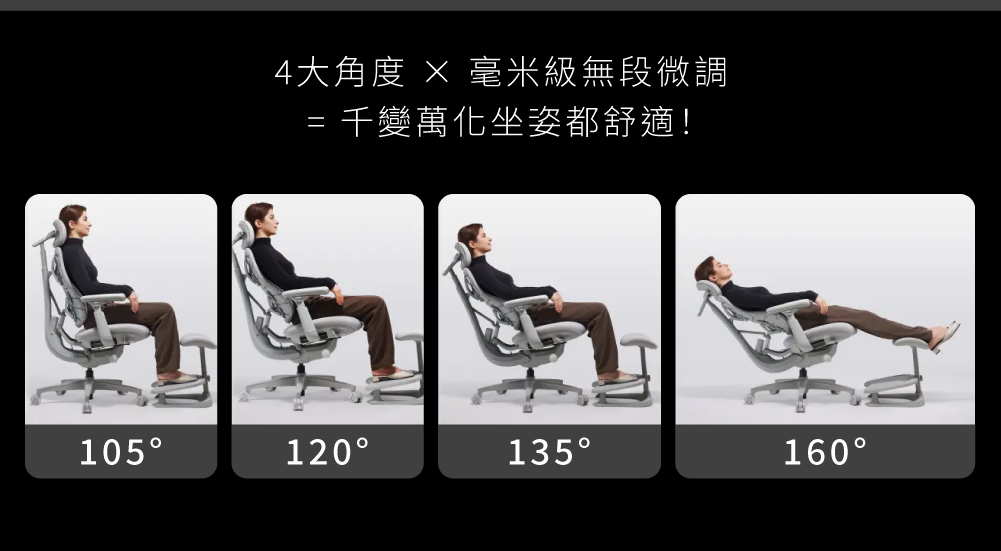 • 105°/120°/135°/160°|4 大模式 任意調節