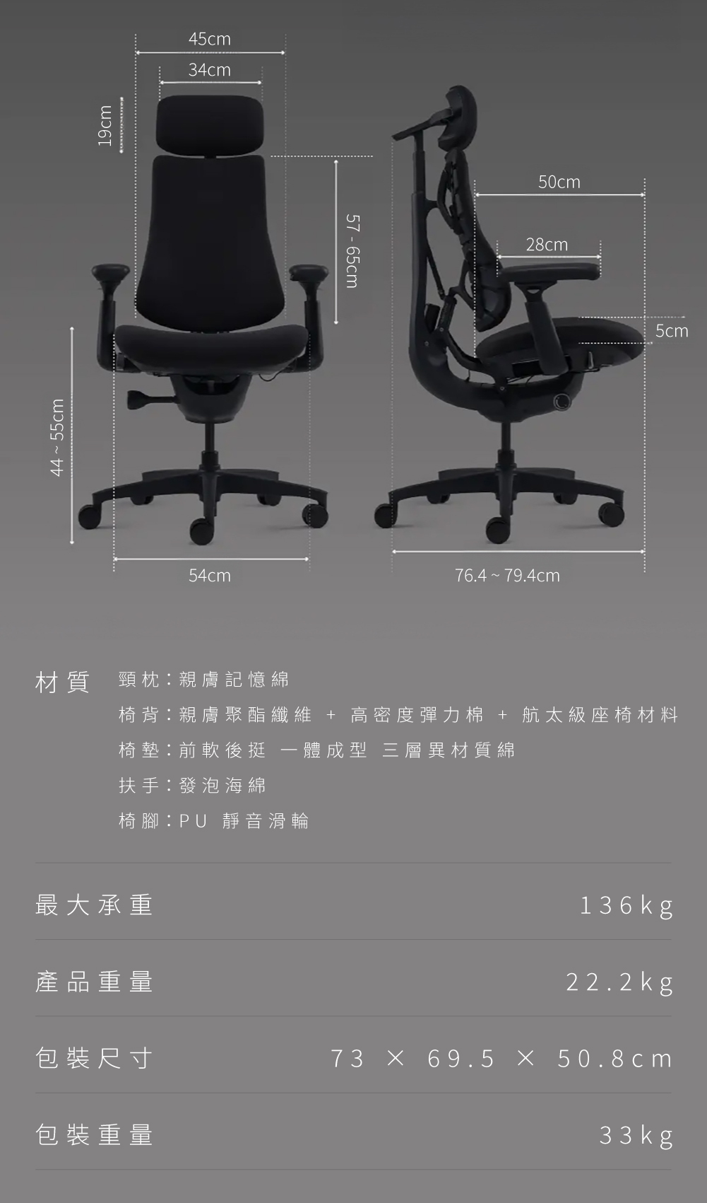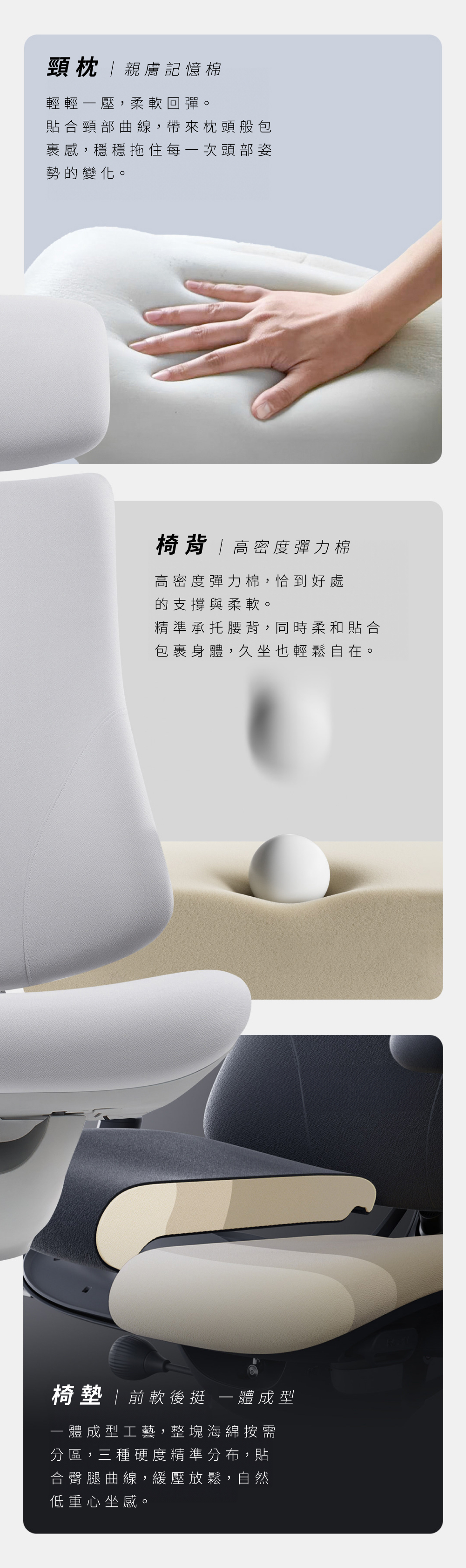 • 全椅舒適材質|頸枕/椅背/椅墊 親膚釋壓